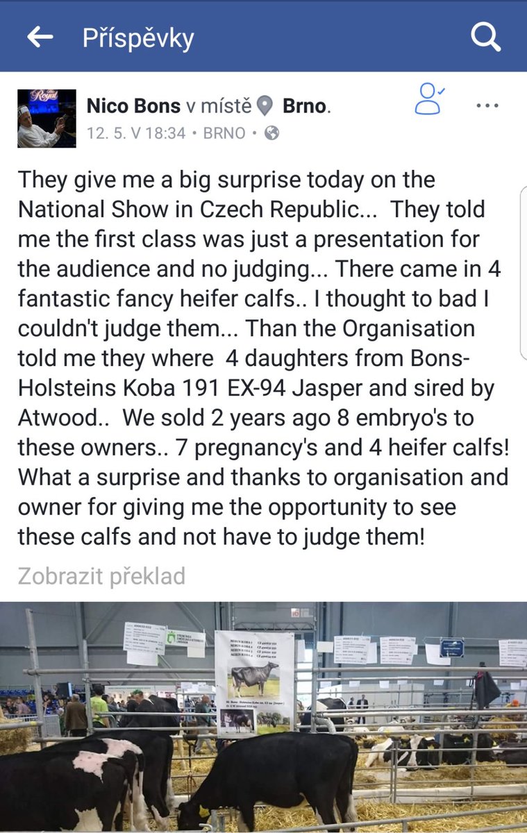Mezníkem holštýnské éry se stala návštěva holandských farem v květnu 2015. Zájezd organizovala firma Gensemex společně s holandským Semexem. Navštívili jsme farmy plné kvalitních krav, ale zcela nás zasáhla zastávka poslední - farma Bons Holstein v majetku rodiny Nica Bonse v Ottolandu. Po ukončení poutavé excurse a přehlídky impozantních zvířat jsme byli pozváni na kávu do galerie kravských ocenění. Zrak přecházel z takového lesku slávy. Během diskuze padl dotaz na embryotransfer. Nico nám ukázal nabídku embryí a ceník. V obojím případě nám spadla brada, v prvním nad vynikající kvalitou, v druhém nad cenami. Ale jedna kombinace nás zaujala nad jiné. Byla to embrya od věhlasné krávy KOBY 191 s býky v heterospermii sexovaný Atwood/Goldwyn. Šli jsme do toho a dnes už víme, že jsme dobře udělali. 8 embryí putovalo do Příkosické a.s., kde byly pro nás připraveny červeno(!)strakaté jalovice jako příjemkyně a po 9 měsících očekávání se narodily čtyři jalovičky. Úžasný výsledek hlavně díky dalšímu ředitelskému kamarádovi, ing. Davidovi Hruškovi, nejlepšímu to konateli ET u nás. Taky musíme pochválit “příkosický” odchov telat, jalovičky byly po 2 měsících mléčné výživy odstaveny ve velmi dobrém zdravotním stavu a optimální kondici. Záhada heterospermie byla objasněna stanovením DNA, všechny čtyři holky mají za tatínka Atwooda. Pak už následoval jejich přesun do stáje na lanškrounské zemědělce.